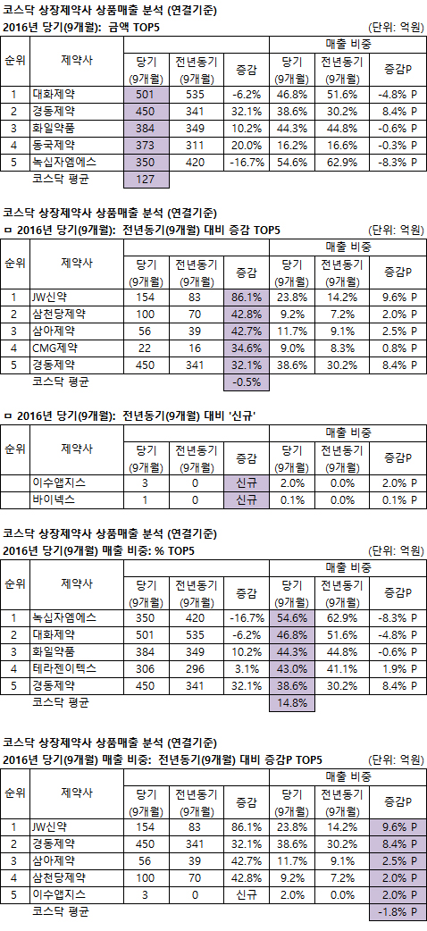 상품매출액이 가장 많은 제약사는 코스피는 유한양행 코스닥은 대화제약, 매출액대비 비중이 가장 높은 제약사는 코스피는 제일약품 코스닥은 녹십자엠에스, 전년동기대비 증감률이 가장 높은 제약사는 코스피는 종근당 코스닥은 JW신약으로 각각 나타났다.