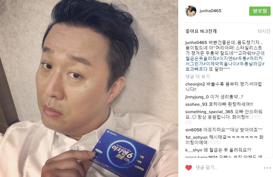 정준하는 지난 28일 자신의 인스타그램에 “바쁜건좋은데…몸도챙기자…몸이힘드네 아~머리아퍼! 스타일리스타가 챙겨준 두통약 잘드네~~고마워!! #근데월급은 못올려줘 #이지엔6 #두통#머리커서그런가#이제약먹을나이#두통날라감#효과빠르다 또 달려~~~” 이라는 글과 함께 두통약 인증사진을 게재했다.