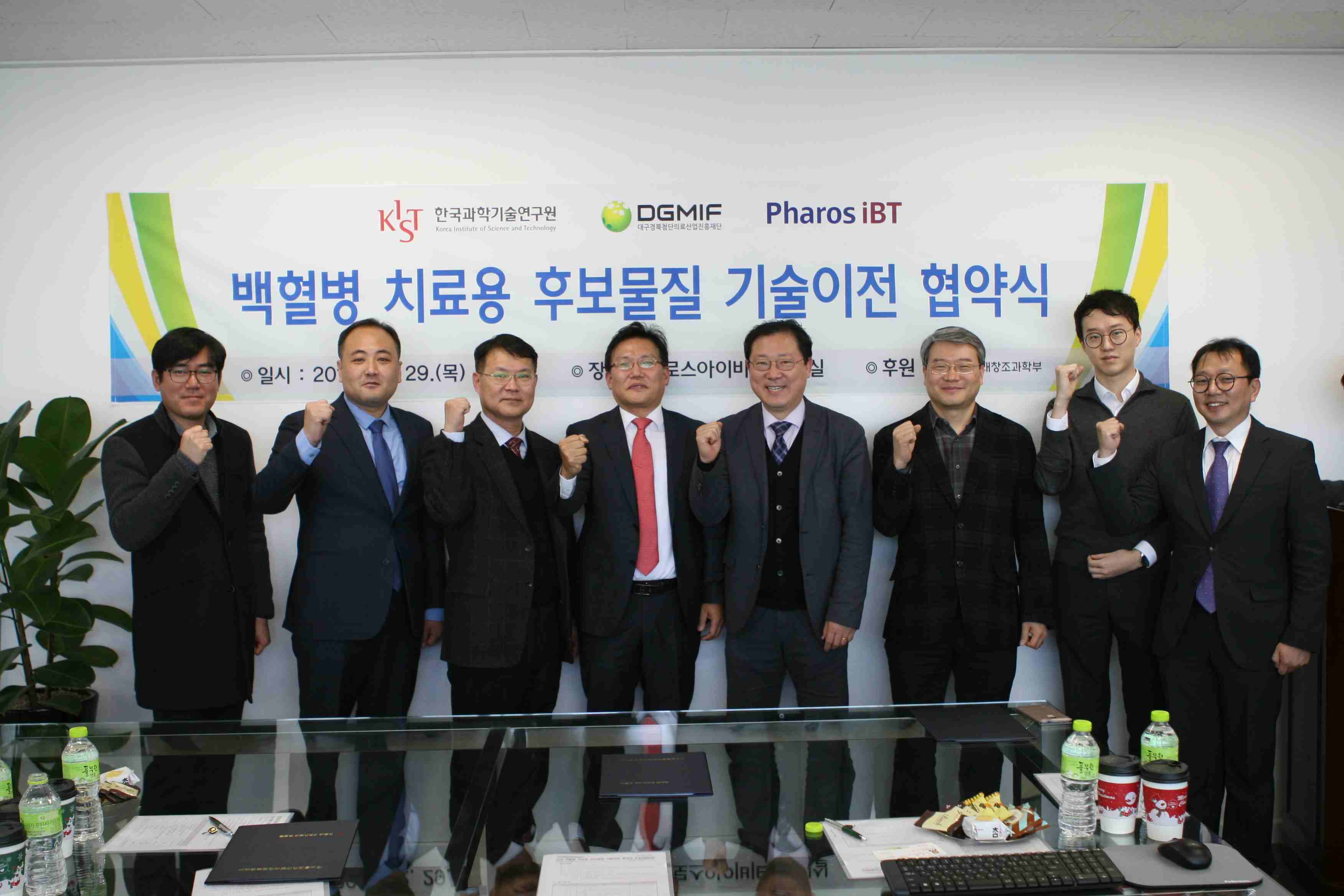 첨복재단과 한국과학기술연구원(원장 이병권, 이하 KIST)은 공동 개발한 ‘FLT3-ITD 저해 기전의 표적 항암제 후보기술’을 12월 29일 (주)파로스아이비티에 기술이전했다고 밝혔다. 급성골수백혈병을 치료하는 차세대 표적항암제 후보물질에 대한 착수 기본료 2억 5천만원에 후속 개발 단계별 성공에 따라 총 15억원의 개발성과금(Milestone Payment) 및 매출액의 3%에 해당하는 경상실시료를 추가 지급받는 조건이다.