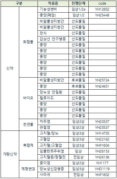 ② YH25724= 이중작용 단백질 바이오신약. 제넥신의 체내지속형 기술(HyFc)을 유한 신약 후보물질과 결합한 바이오신약. 비알코올성지방간을 1차 적응증으로 연구개발 중이며, 향후 당뇨 및 비만으로 적응증 확장 가능. 현재 대량생산을 위한 공정개발중에 있으며 2017년 전임상 및 임상연구 진행 예정.