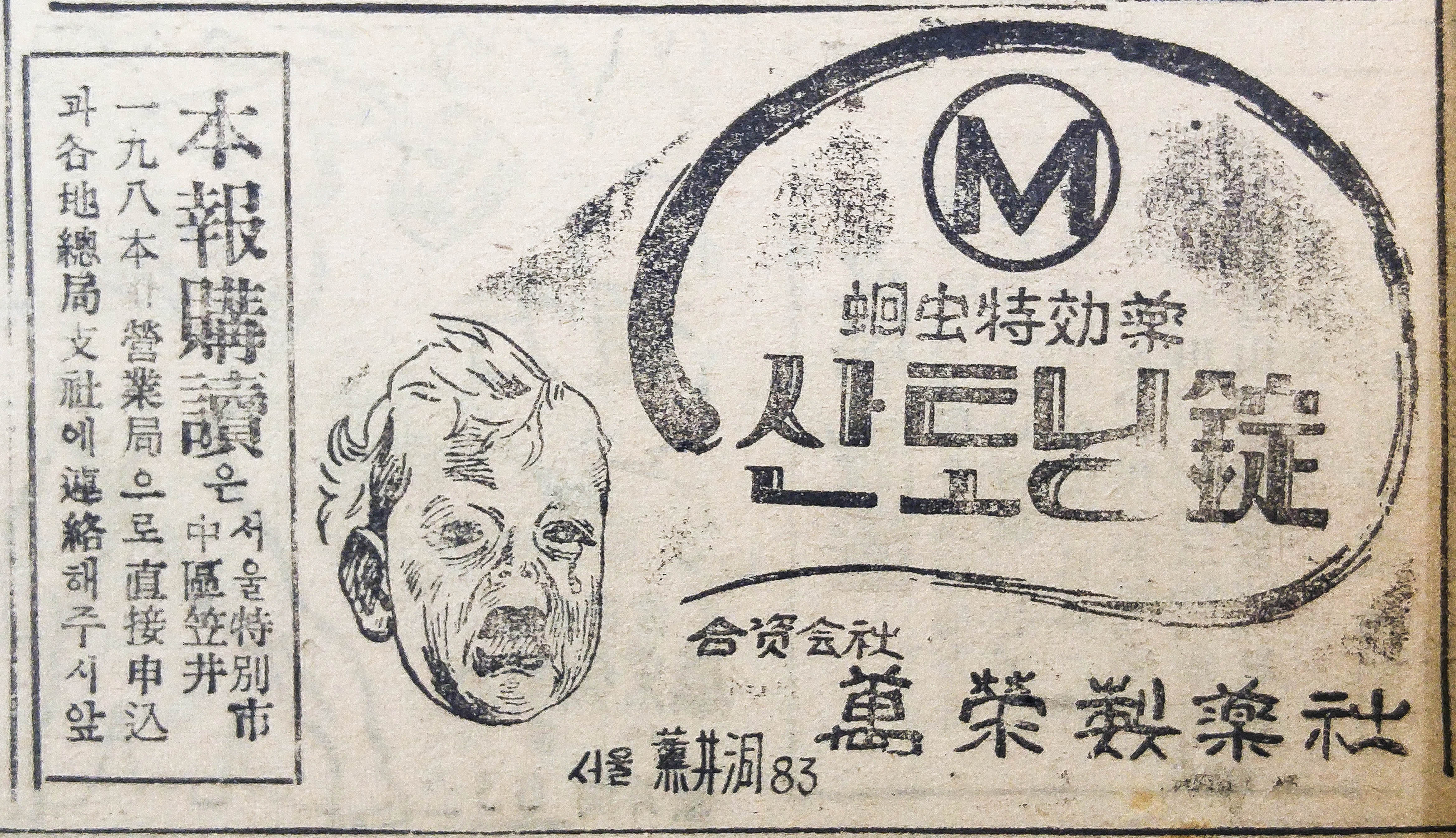 蛔虫特効藥(회충특효약)으로  소개된 산토닝錠(정) 광고에 등장하는 우는 영아의 얼굴은 마치 밝은색 곱슬 머리를 가진 서양어린이를 연상케 한다. 이는 아마도 이 제품의 원모델을 이미지메이킹 하는 과정에서 불가피했던것이 아닌가 하는 추측을 해본다.
