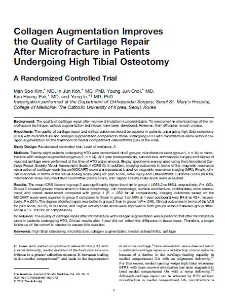 이 논문(제목: Collagen Augmentation Improves the Quality of Cartilage Repair After Microfracture in Patients Undergoing High Tibial Osteotomy: A Randomized Controlled Trial)은 콜라겐(바이오콜라겐이 주원료인 세원셀론텍의 ‘카티필’)을 이용한 미세골절술이 근위경골절골술(HTO)을 동반한 무릎 골관절염(OA) 치료에 미치는 영향을 조사한 것으로, 정형외과 분야의 세계적 권위지인 ‘American Journal of Sports Medicine’ 최신호에 등재됐다.