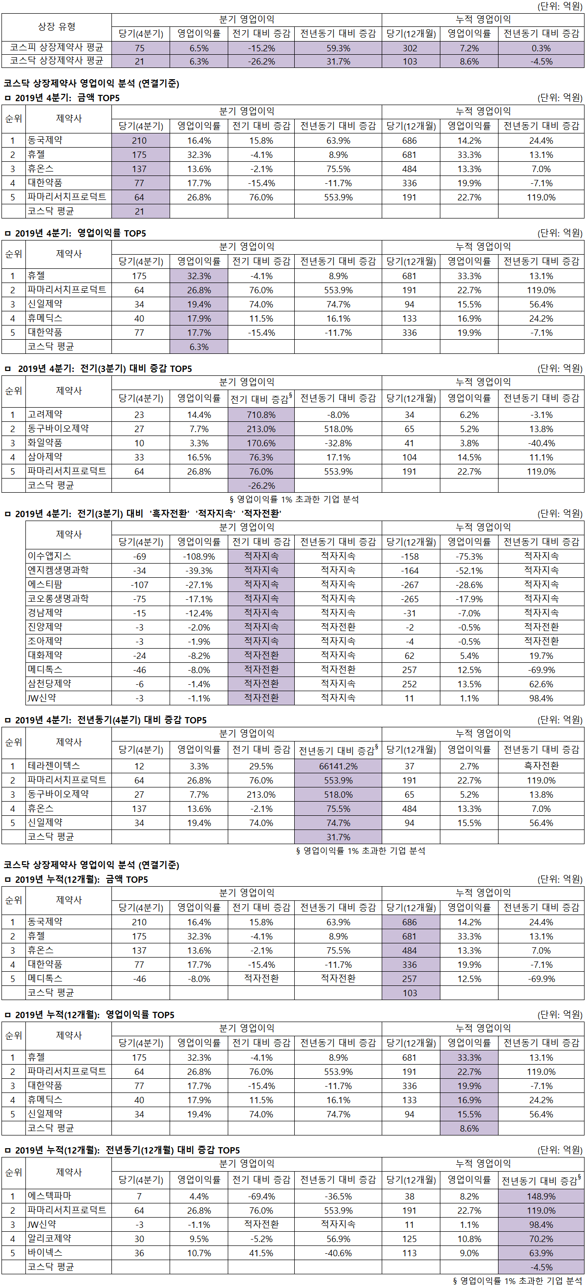 코스피상장 제약사(39곳): 4분기=영업이익은 셀트리온 삼성바이오로직스가 1천억원을 넘었고, 한미약품 종근당이 200억원 대로 뒤를 이었다. 한국유나이티드제약이 109억으로 '톱5'에 들었다(평균 75억)