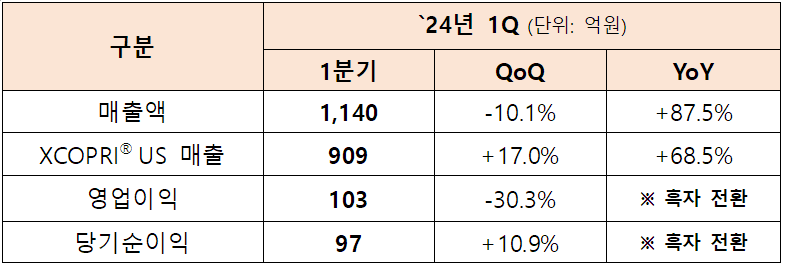 세노바메이트(미국 제품명: 엑스코프리®/XCOPRI®)의 `24년 1분기 미국 매출은 909억원으로 전년 동기 대비 68.5%, 전분기 대비 17%로 빠른 성장세를 보여주었다. 그 매출 규모와 90% 중반에 달하는 매출총이익률 등을 고려할 때, 향후 안정적인 흑자를 달성할 수 있을 것으로 예상되는 점이 주목할 만한 부분이다.