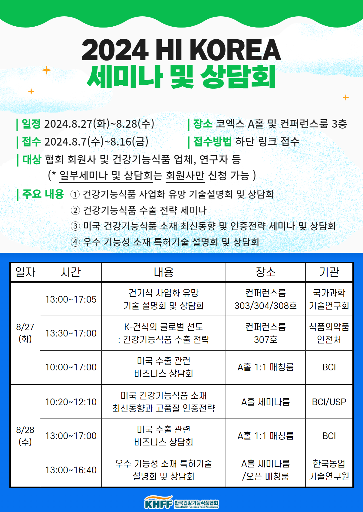전시회 후원 기관인 건기식협회는 27일과 28일 양일간 건강기능식품 산업 관련 국내외 유관 기관과 협력해 다양한 주제로 세미나를 운영하고, 참가 기업의 실질적 비즈니스 창출을 돕기 위한 1:1 매칭 상담 프로그램을 진행한다.