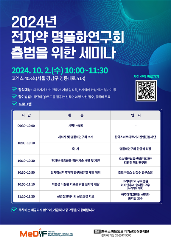 이번 세미나는 전자약 분야에서 산·학·연·병 간 협력 체계를 강화하고, 지속 가능한 성장을 도모하기 위해 마련됐다. 발표 세션에서는 △전자약 상용화를 위한 기술 개발 및 지원(오송첨단의료산업진흥재단 김영진 책임연구원) △전자창상피복재 연구 동향 및 개발 계획(한국젬스 김정수 연구소장) △퇴행성 뇌질환 치료를 위한 전자약 개발(고려대학교 구로병원 송재준 교수, 뉴라이브 대표) △신경질환에서의 신경조절 치료(아주대학교병원 홍지만 교수) 등 다양한 주제가 다뤄질 예정이다.