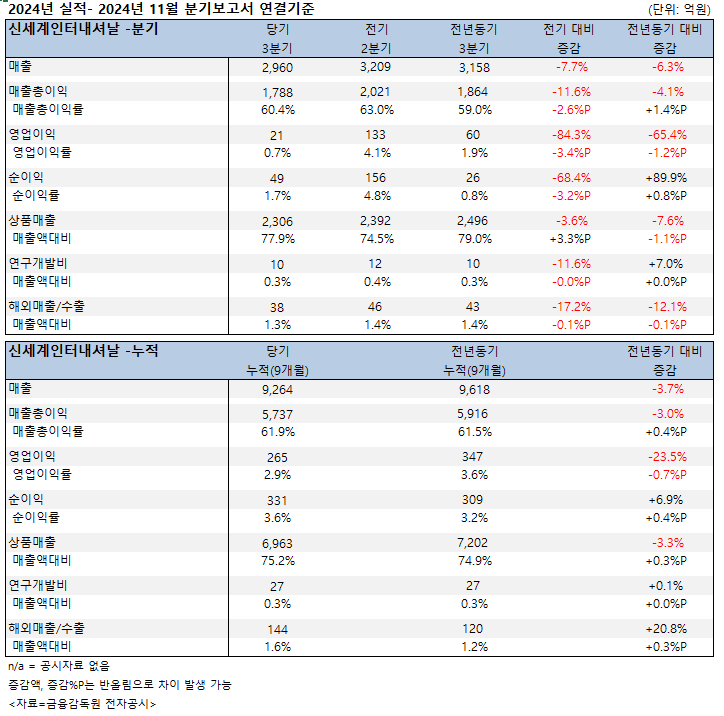 약업신문 자매지 화장품신문이 금융감독원 공시 2024년 11월 분기보고서(연결기준) 분석 결과, 올해 1~3분기 누적(이하 누적) 기준 신세계인터내셔날은 9264억원의 매출을 기록했다. 전년동기 9618억원 대비 3.7% 감소했다. 영업이익은 265억원으로 전년동기 347억원 대비 23.5% 줄었다. 순이익은 331억원을 기록해 전년동기 309억원 대비 6.9% 증가했다.