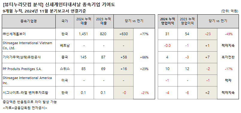 종속기업별로는 국내 소재 ㈜신세계톰보이, 중국 소재 기아가무역(상해)유한공사, 스위스 소재 PP Produits Prestiges SA 순으로 기여도가 높은 편이다. 특히 중국소재 종속기업은 흑자전환했다.