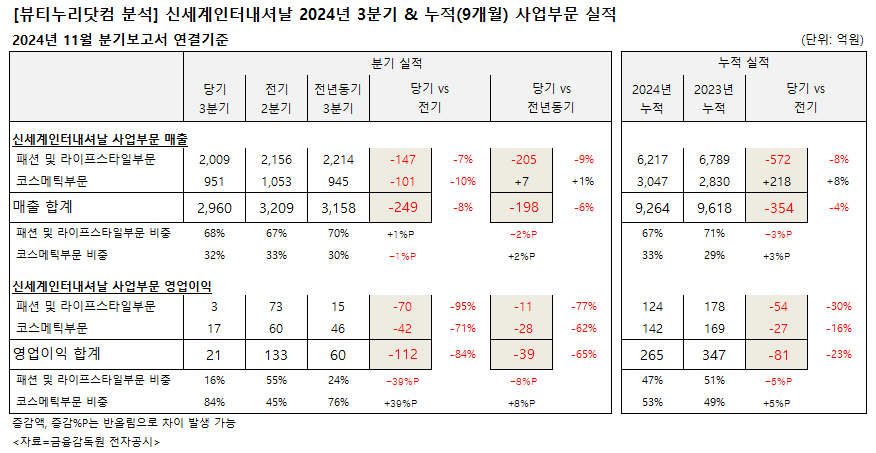 사업부문별로는 화장품 사업은 매출이 소폭 증가했으나 비중이 큰 패션 및 라이프스타일 부문 실적이 부진하면서 전반적으로 역성장했다.