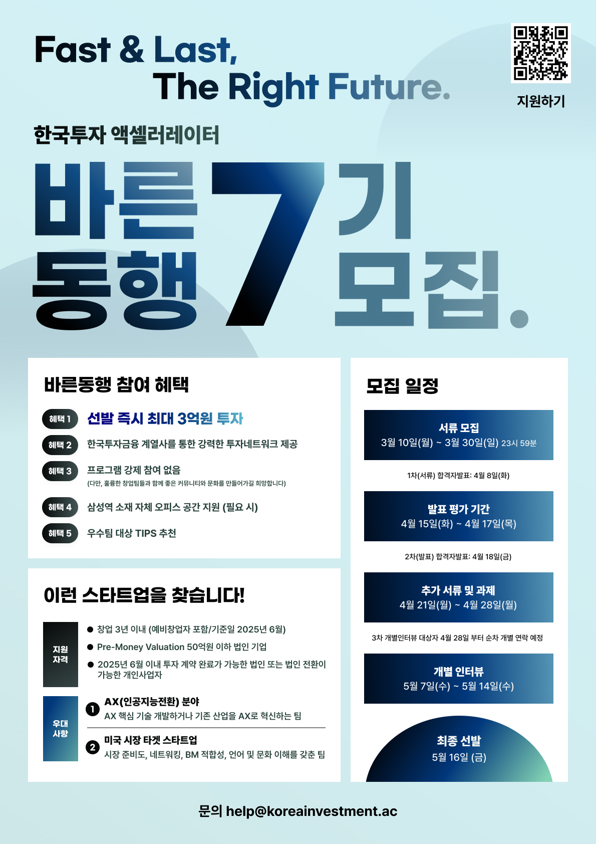 한국투자액셀러레이터(대표 백여현)가 초기 스타트업 성장을 지원하는 '바른동행 7기'에 참여할 혁신 스타트업을 모집한다. 1차 서류 모집 기간은 10일) 14시부터 3월 30일까지다.