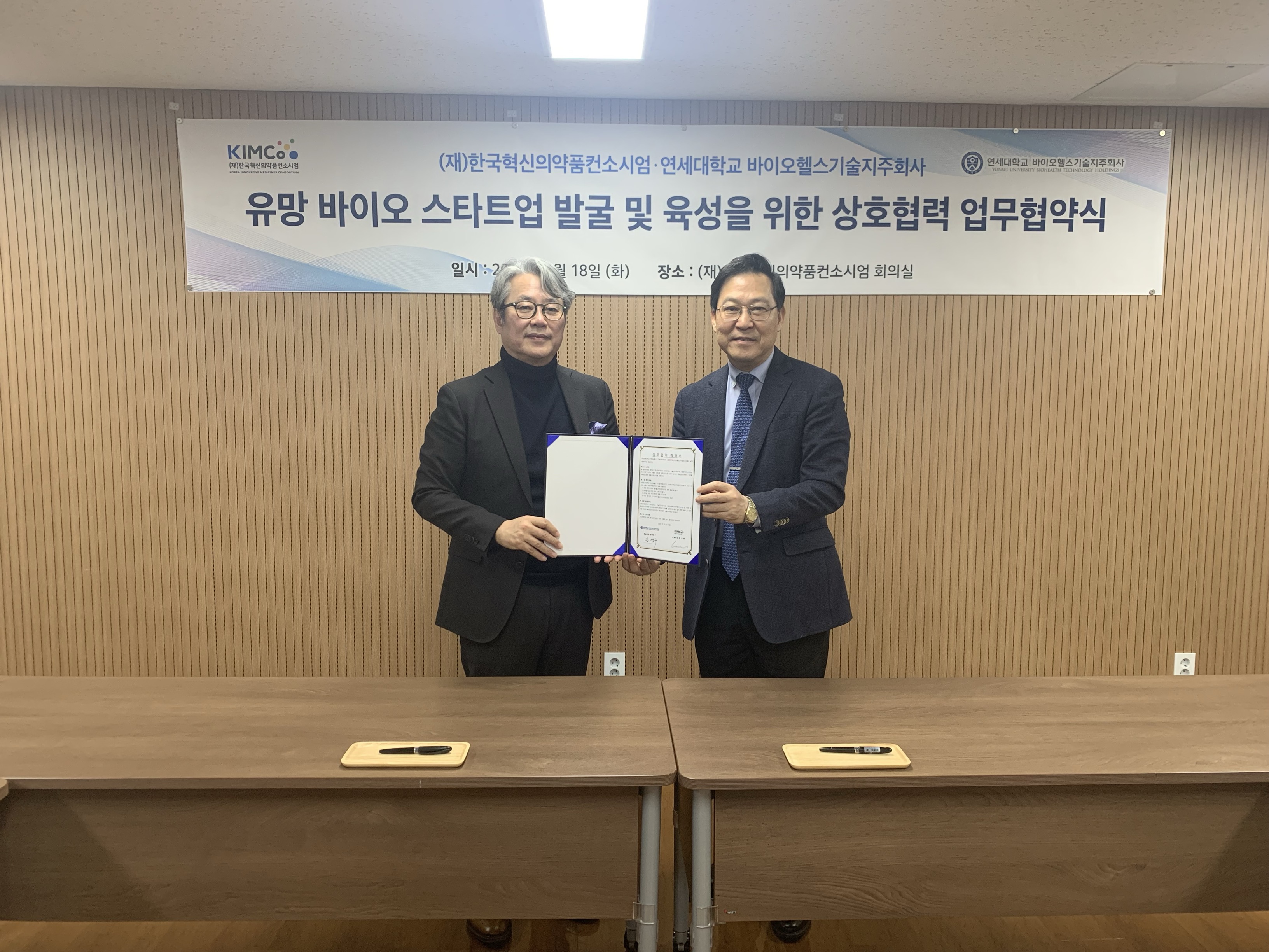재단법인 한국혁신의약품컨소시엄(대표 허경화, 이하 KIMCo재단)과 연세대학교 바이오헬스기술지주회사(대표 송영구)가 18일 상호협력 업무협약(MOU)을 맺고 제약·바이오 및 헬스케어 분야 유망 스타트업 발굴·육성 및 투자 활성화에 나섰다.
