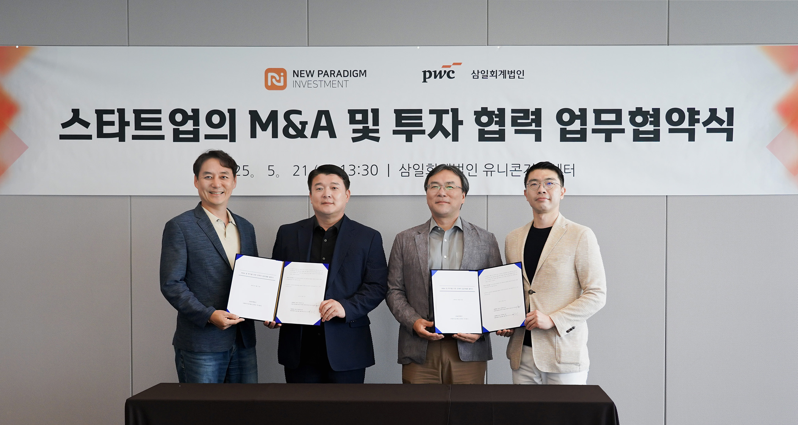 삼일PwC(대표이사 윤훈수)는 지난 21일 서울 용산구 본사에서 스타트업 스케일업 전문 액셀러레이터인 뉴패러다임인베스트먼트(공동대표 배상승, 박제현)와 스타트업 대상 인수합병(M&A) 활성화를 위한 업무협약(MOU)을 체결했다고 22일 밝혔다.
