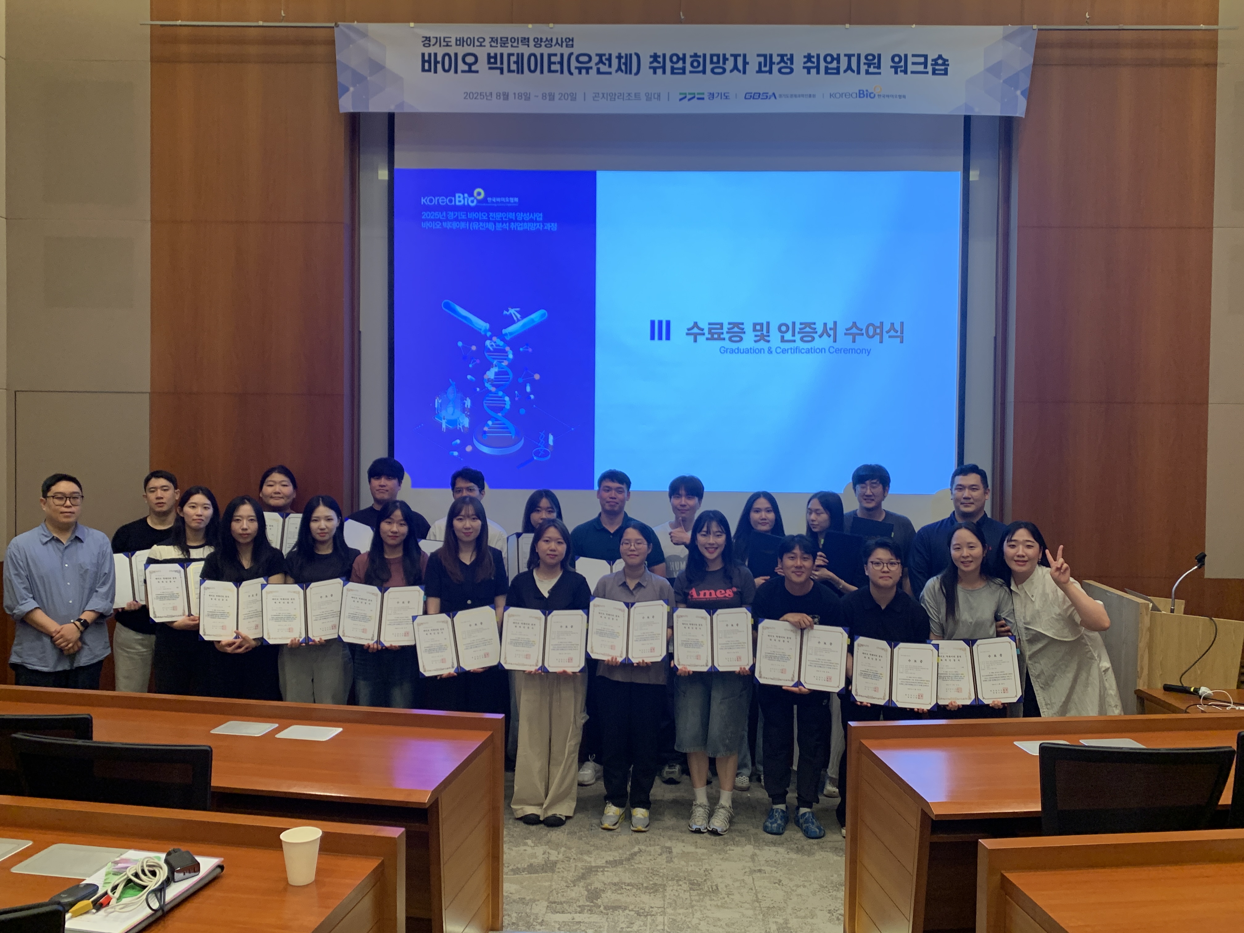 경기도 지원으로 경기도경제과학진흥원이 주관하고 한국바이오협회가 운영한 ‘2025년도 바이오 빅데이터(유전체) 분석 취업희망자 과정’이 6월 9일부터 8월 20일까지 10주간 진행돼 성황리에 마무리되었다.
