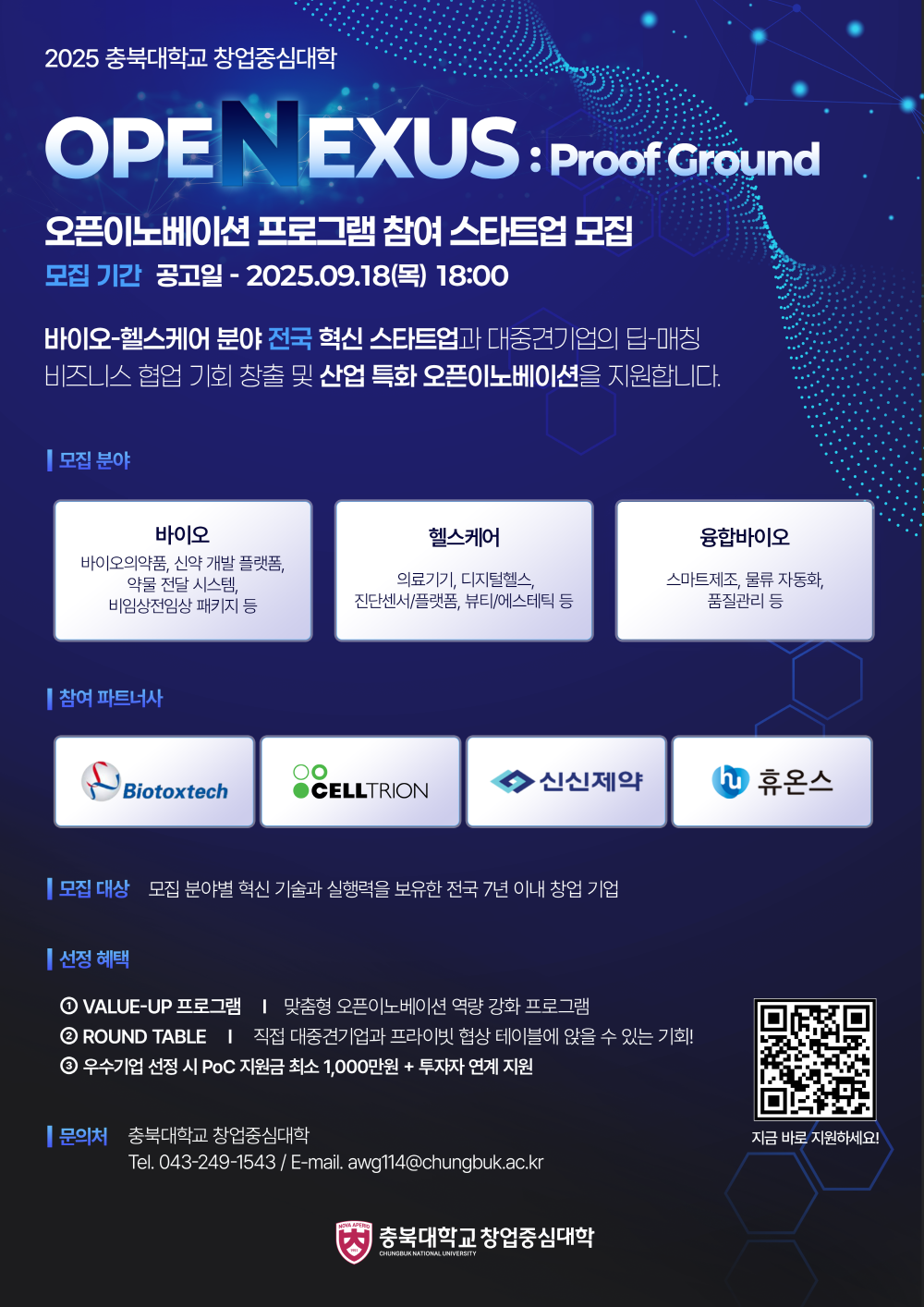 창업중심대학 사업을 수행 중인 충북대학교(총장 고창섭) 창업지원단은 대·중견기업-스타트업 오픈이노베이션 프로그램 『2025 충북대 창업중심대학 오픈넥서스 : Proof Ground』의 참가기업을 9월 18일까지 모집한다고 밝혔다.