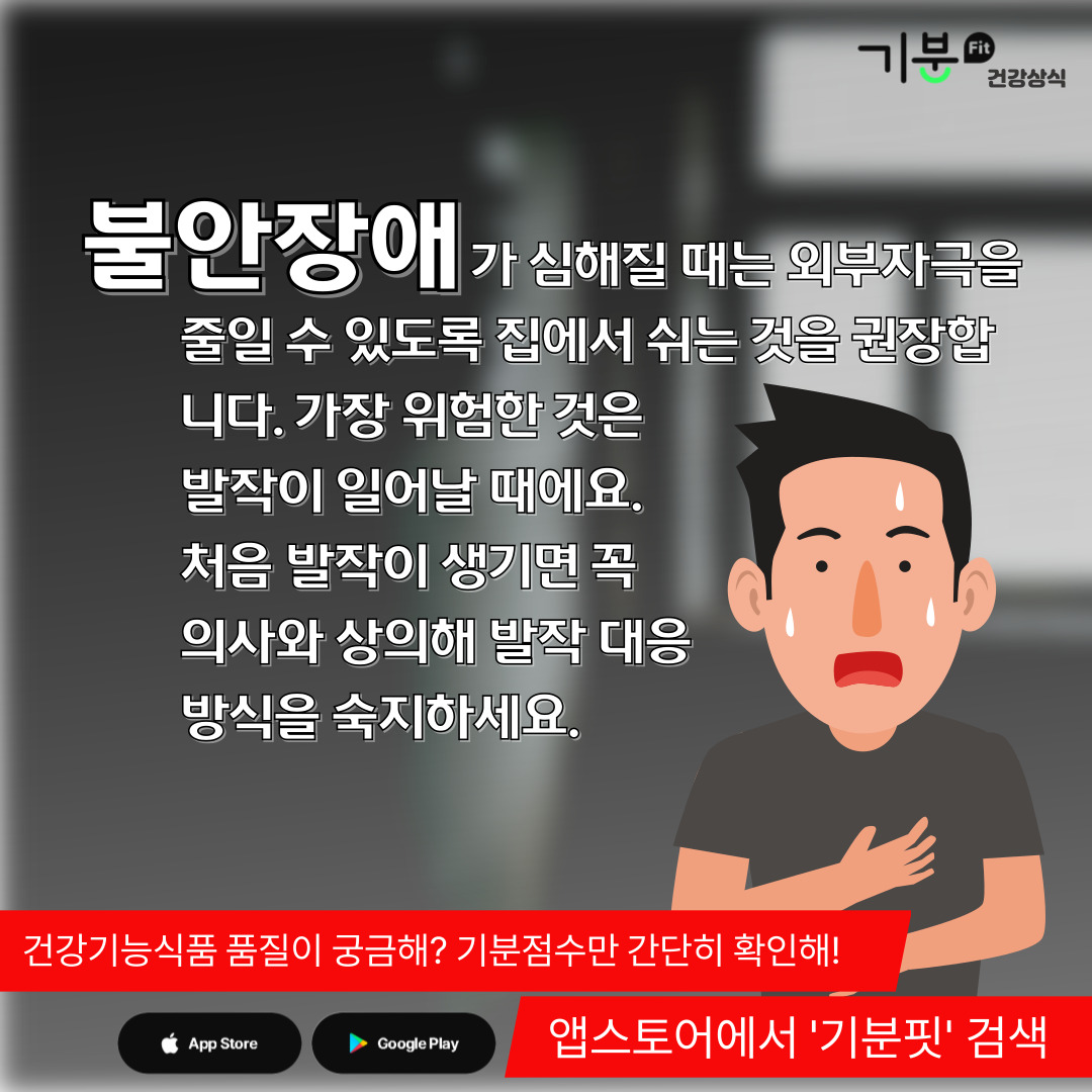 이와 함께 갑자기 불안장애 증상이 심해지는 것에 대비해 스스로 관리할 수 있는 방법을 찾아보는 것도 필요하다.