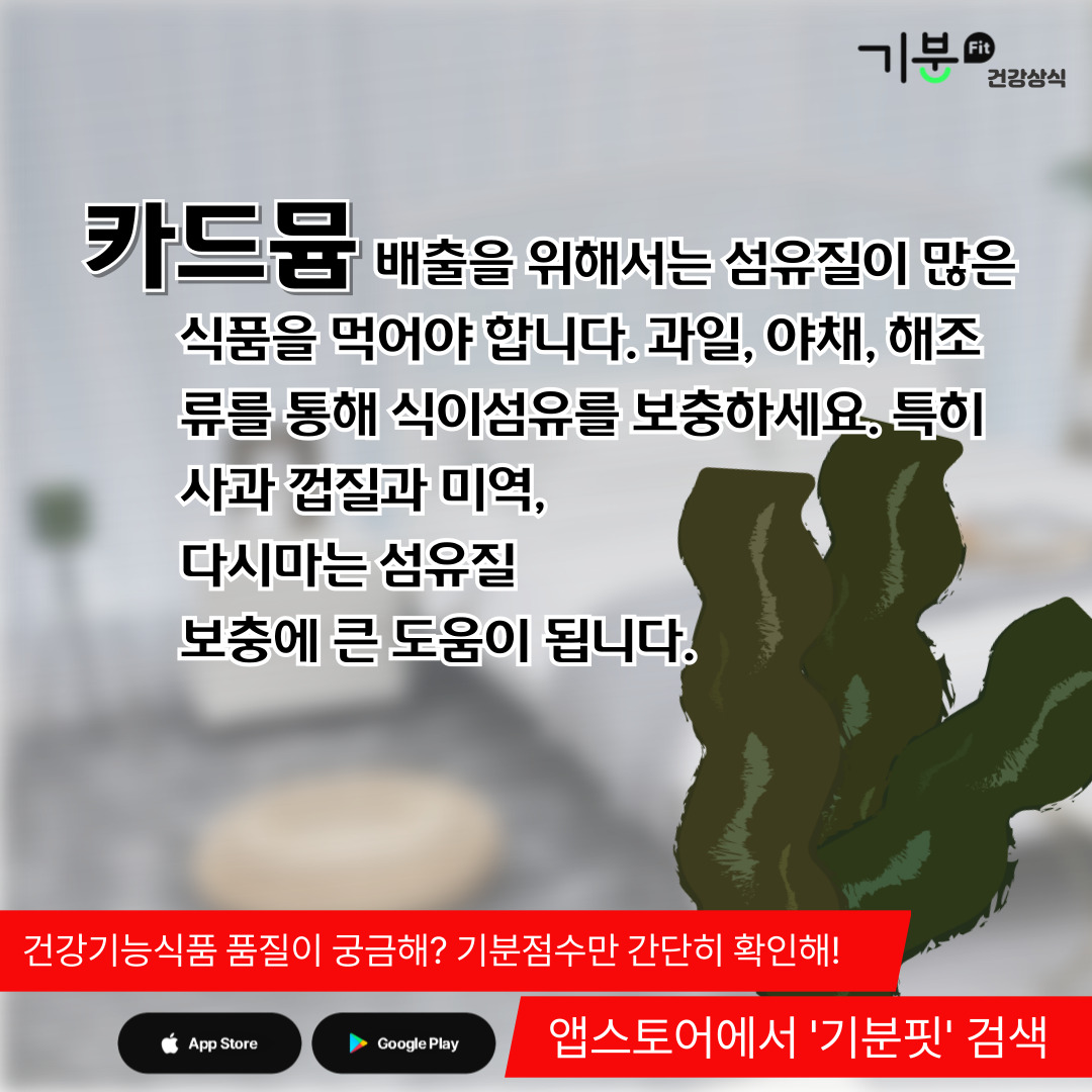 특히 유용한 것은 팩틴이 많은 사과 껍질과 알긴산이 많은 미역, 다시마다. 이런 음식을 자주 먹으면 카드뮴 배출에 도움이 된다.