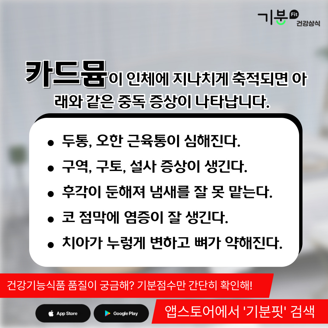 카드뮴은 인체에 축적되기 때문에 지나치게 많은 카드뮴이 몸에 유입되면 중독증상을 일으키게 된다.