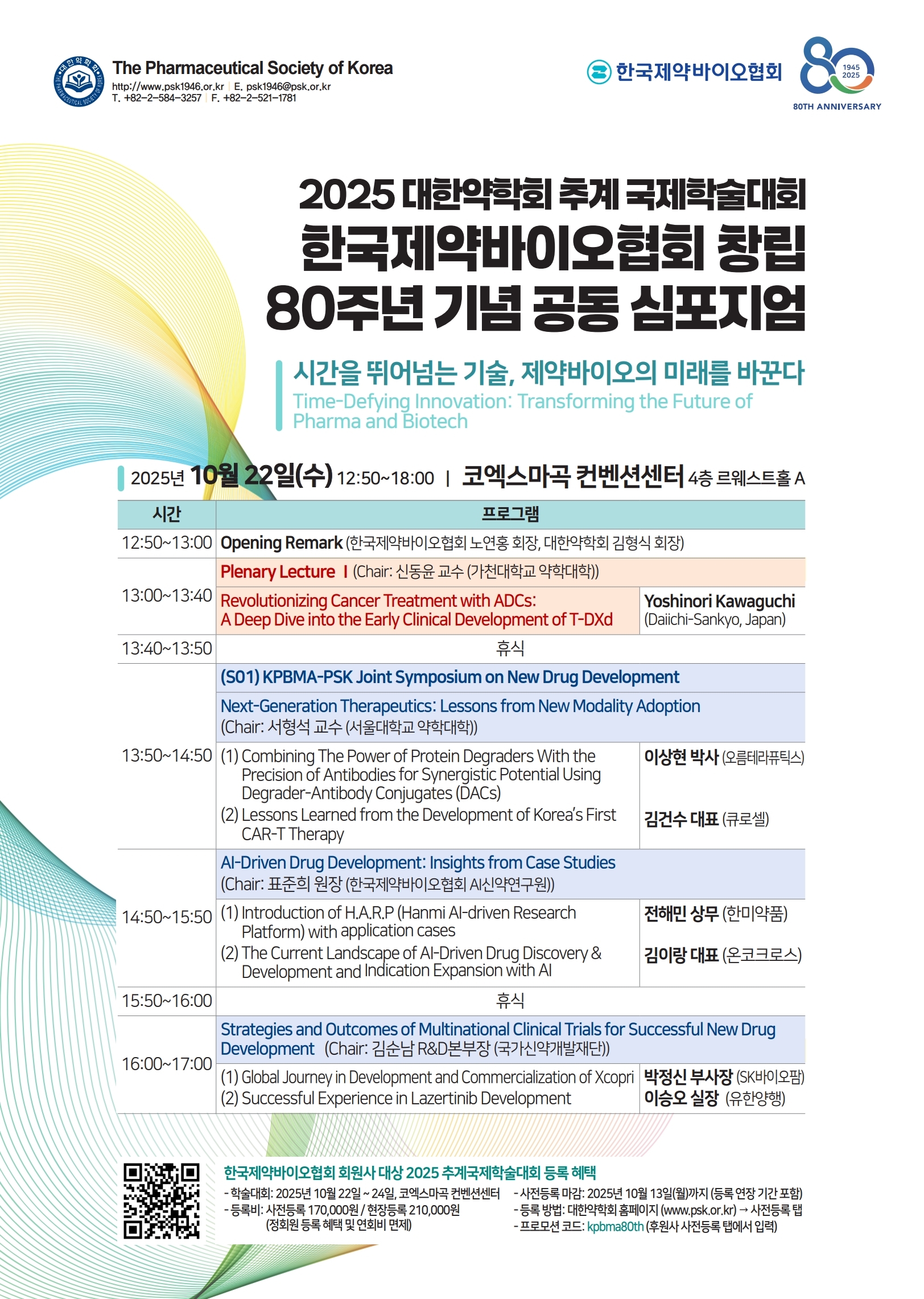이번 심포지엄은 ‘시간을 뛰어넘는 기술, 제약바이오의 미래를 바꾼다’를 주제로 ‘2025 대한약학회 추계 국제학술대회’ 기간 중 진행된다. 행사는 협회 창립 80주년 기념사업의 하나로, 대한민국 신약개발의 청사진을 제시하기 위해 산업계와 학계가 함께 준비했다.