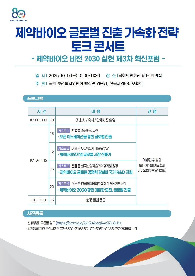노연홍 회장은 “이번 제3차 혁신포럼은 우리 제약바이오산업이 세계 시장에서 더 큰 도약을 이룰 수 있도록 산·학·정·언론이 협력 의지를 다지는 장이 될 것”이라며 “창립 80주년을 맞아 ‘제약바이오 비전 2030’ 실현을 위해 다양한 논의와 실천을 이어가겠다”고 밝혔다.