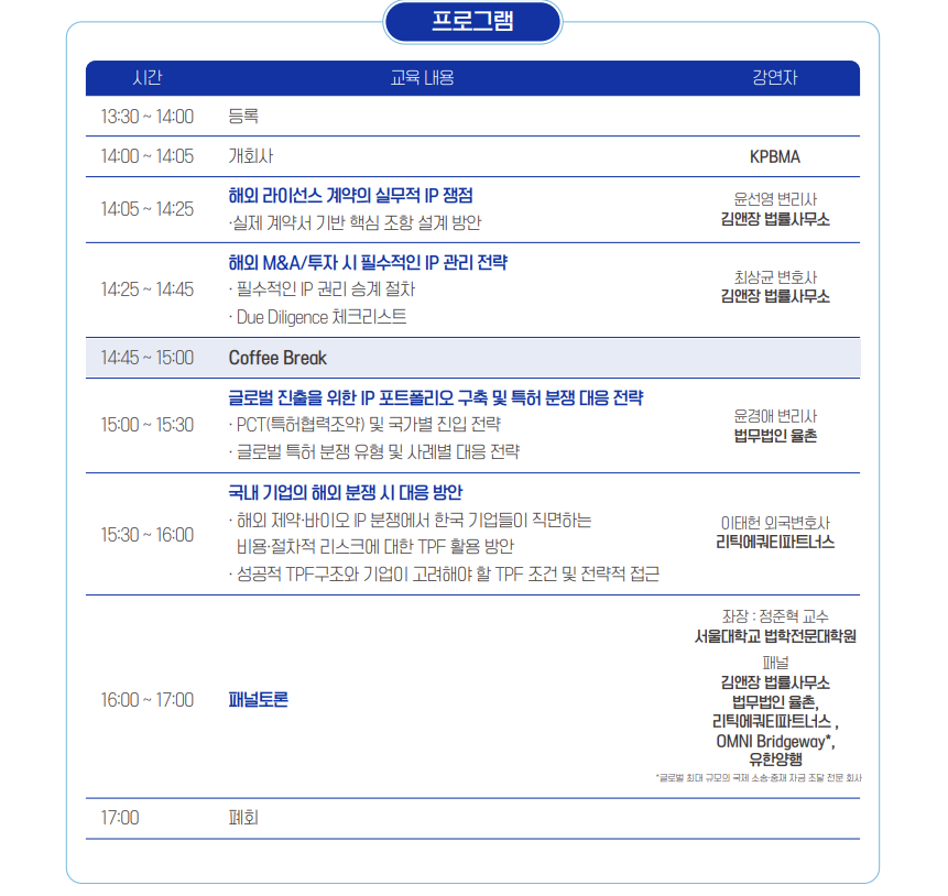 이후에는 ‘글로벌 제약바이오 시장에서 한국 기업의 IP 전략과 도전과제’를 주제로 패널토론이 진행된다. 좌장은 서울대학교 법학전문대학원 정준혁 교수가 맡으며, 패널에는 김앤장 법률사무소, 법무법인 율촌, 리틱에쿼티파트너스, 유한양행, OMNI Bridgeway(글로벌 TPF 펀딩 그룹) 관계자가 참여한다. 패널토론에서는 국내 제약바이오기업이 해외 공동개발 과정에서 경험한 IP 리스크 관리 사례와 해외 제약바이오 분야의 펀딩 활용 사례를 함께 다루며, 국내 기업의 글로벌 진출을 위한 효과적인 IP 전략 구축 방안을 다각적으로 논의할 예정이다.