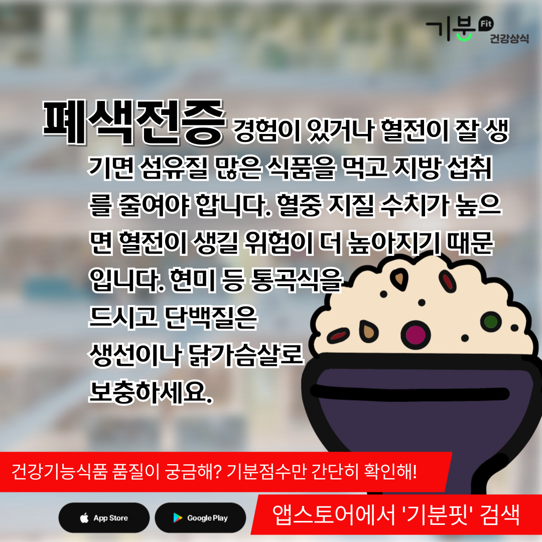 폐색전증 발병 경험이 있거나 혈전이 잘 생기는 사람들은 섬유소를 충분히 섭취하고 지방 섭취를 줄이도록 해야 한다.
