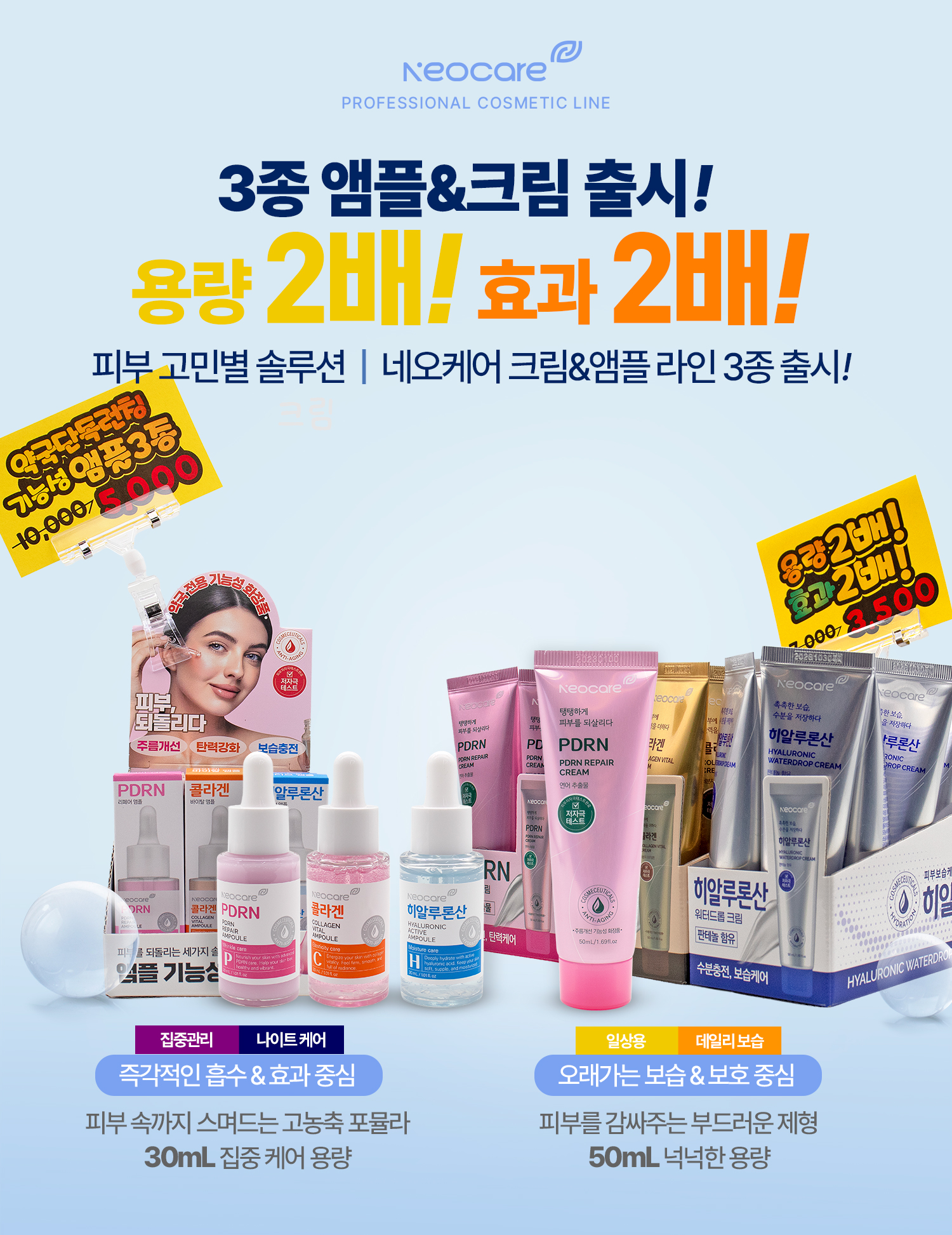 치약 OEM 전문기업 네오메디칼제약(대표: 이상돈)이 약국 전용 스킨케어 신제품 ‘피부고민 솔루션 크림·앰플 3종’을 새롭게 출시하며 스킨케어 시장에 본격 진입했다.