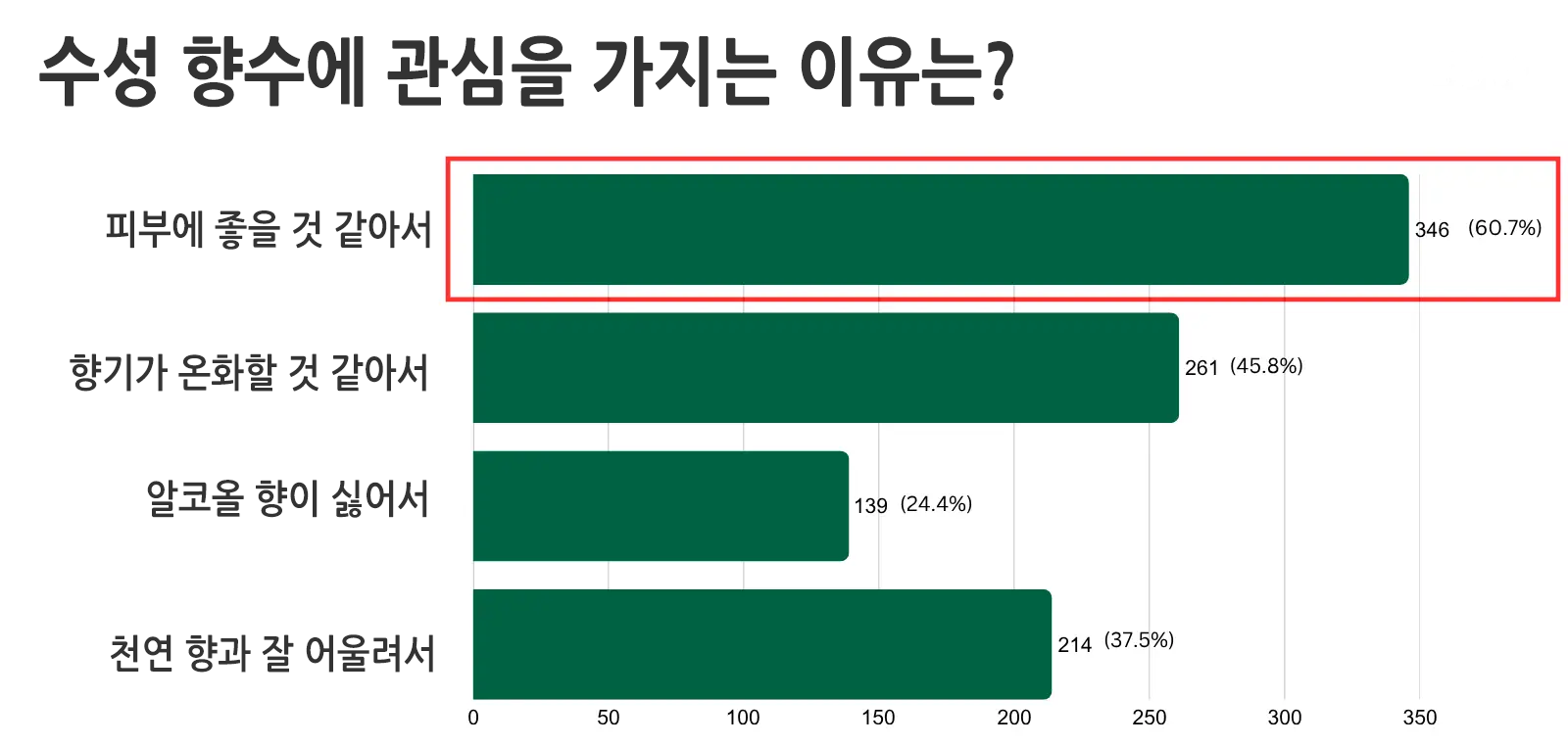 수성 향수는 알코올 특유의 자극적인 향을 꺼리는 사람들에게 새로운 대안이 될 수도 있다. 수성 향수에 관심이 있다고 밝힌 응답자의 24.4%는 “알코올 향이 싫어서”라고 밝히기도 했다.