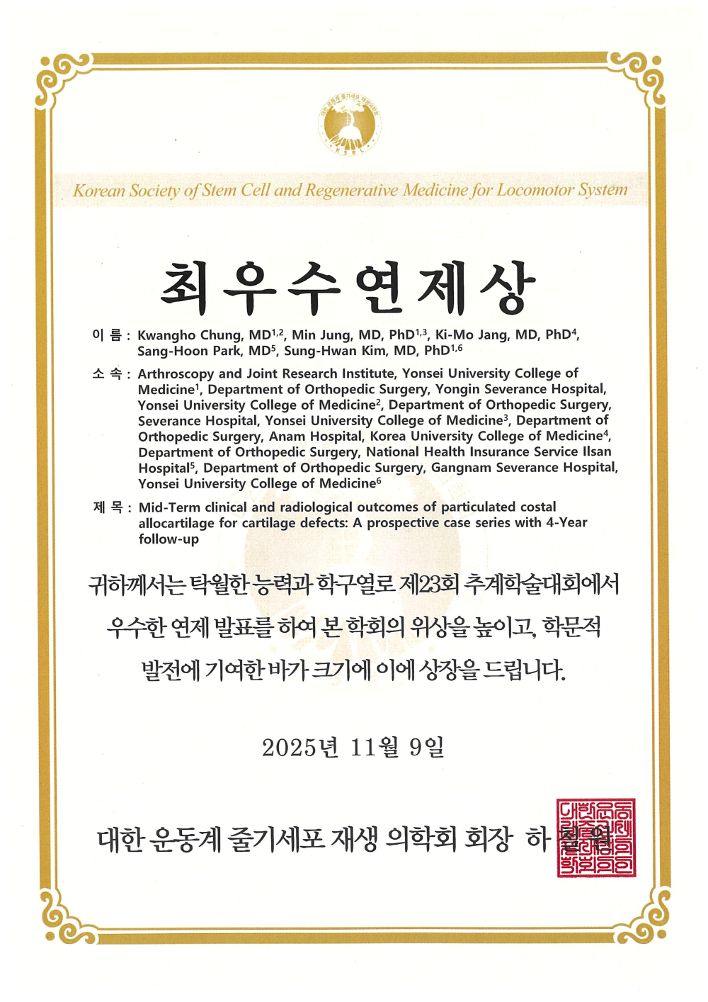 이번 수상은 지난 9일 열린 제23회 대한운동계줄기세포재생의학회 추계학술대회에서 용인세브란스병원 정형외과 정광호 교수가 발표한 ‘미분화된 늑연골 동종이식(Particulated Costal Allograft)을 이용한 연골결손 치료의 4년 추적 결과’ 연구에 대한 것이다.