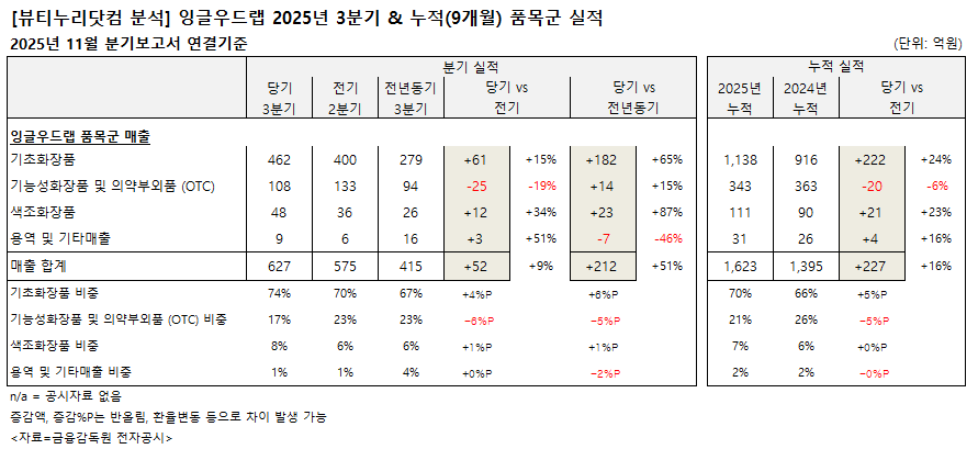 약업신문 자매지 화장품신문이 금융감독원 공시 2025년 11월 분기보고서(연결기준) 분석 결과, 올해 3분기 잉글우드랩은 627억원의 매출을 기록했다. 전기 575억원 대비 9.0%, 전년동기 415억원 대비 51.0% 각각 증가했다. 영업이익은 134억원을 기록했다. 전기 101억원 대비 33.3%, 전년동기 41억원 대비 226.6% 각각 성장했다. 순이익은 112억원으로 전기 29억원 대비 283.4%, 전년동기 5억원 대비 1950.7% 각각 급증했다.