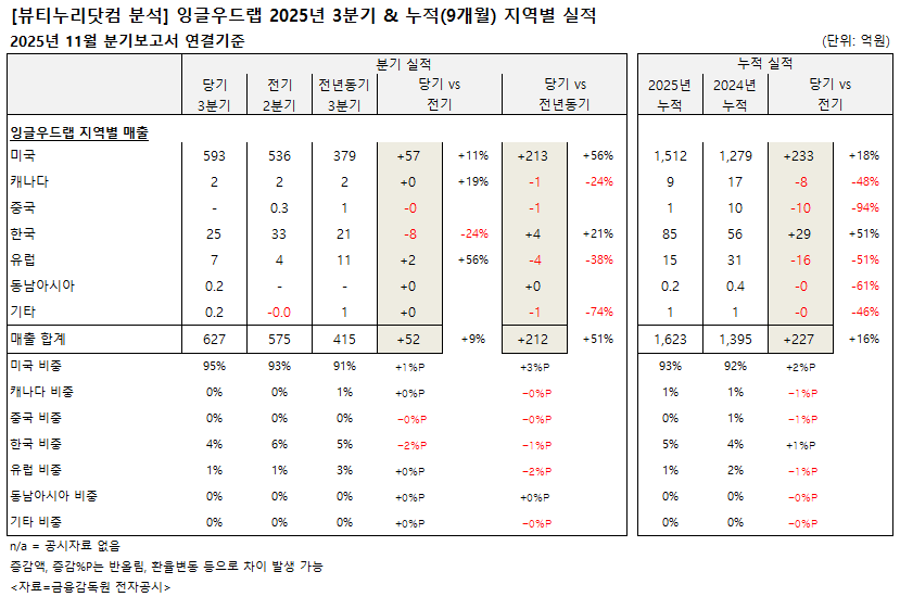 미국 지역 3분기 매출은 593억원으로 전기 536억원 대비 11%, 전년동기 379억원 대비 56% 각각 증가했다. 비중은 95%. 3분기 누적 매출은 1512억원으로 전년동기 1279억원 대비 18% 늘었다. 비중은 93%.