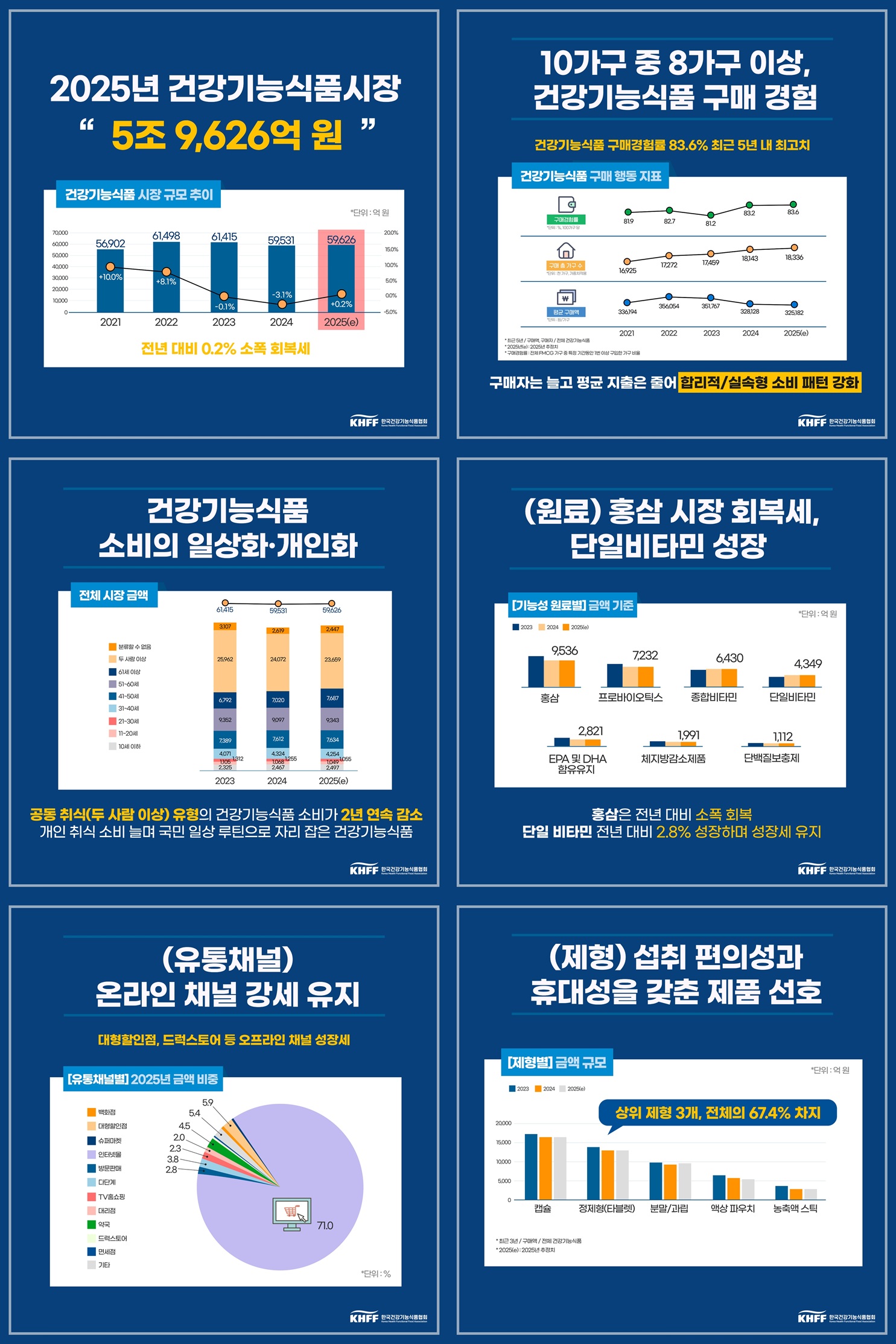 한국건강기능식품협회(회장 정명수, 이하 건기식협회)는 2025년 국내 건강기능식품 시장 규모가 5조 9,626억 원으로, 전년 대비 소폭 회복세(0.2%)를 보였다고 20일 밝혔다