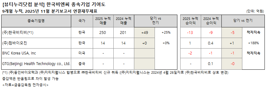 한국비엔씨는 올해 3분기 영업손실과 순손실을 기록하면서 전기 및 전년동기 대비 적자전환했다. 화장품 누적 매출은 전년동기 대비 200% 성장했다.