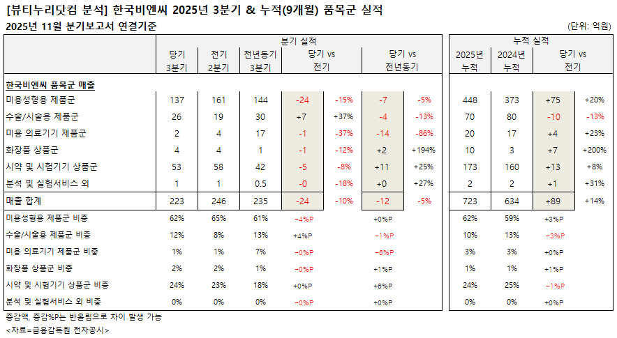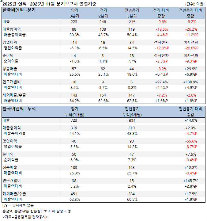 약업신문 자매지 화장품신문이 금융감독원 공시 2025년 11월 분기보고서(연결기준) 분석 결과, 한국비엔씨는 올해 3분기 223억원의 매출을 올린 것으로 나타났다. 전기 246억원 대비 9.6%, 전년동기 235억원 대비 5.2% 각각 감소했다. 14억원의 영업손실이 발생, 영업이익을 기록했던 전기(16억원) 및 전년동기(34억원) 대비 적자전환했다. 4억원의 순손실이 나면서, 순이익을 거둬들였던 전기(3억원) 및 전년동기(18억원) 대비 적자전환했다.