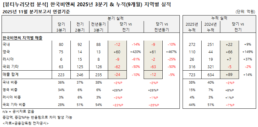 영국 지역의 3분기 매출은 75억원으로 전기 14억원 대비 420%, 전년동기 13억원 대비 467% 각각 급증했다. 비중은 전기 및 전년동기 6%에서 34%로 확대됐다. 3분기 누적 매출은 110억원으로 전년동기 44억원 대비 149% 성장했다. 비중은 전년동기 7%에서 15%로 커졌다.