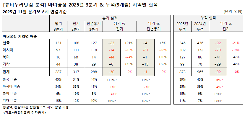 지역별로는 3분기 기준 전기 대비 북미 지역 매출이 급감했으며, 아시아 지역 매출도 줄어 내수 비중이 커졌다.