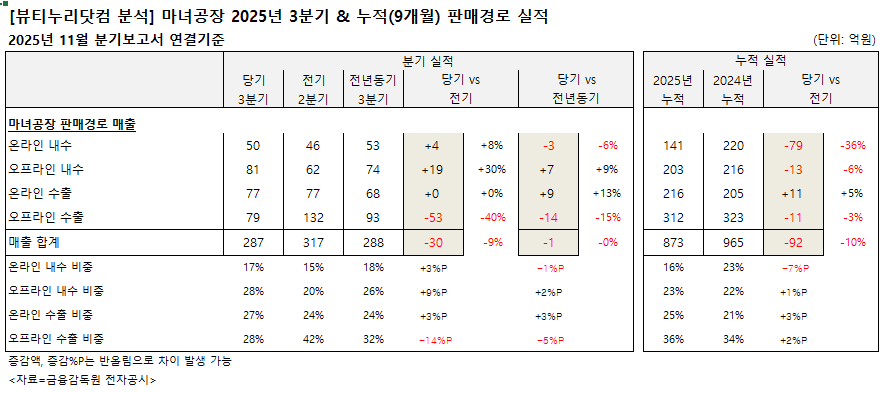 판매경로별 실적을 살펴보면, 오프라인 수출 물량이 3분기엔 전기 대비 급감했으나. 누적 기준으로는 비중이 가장 크다.