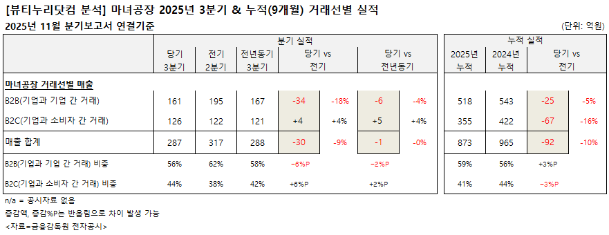 3분기 누적 기준 거래선별 실적은 B2B와 B2C 모두 감소했다.