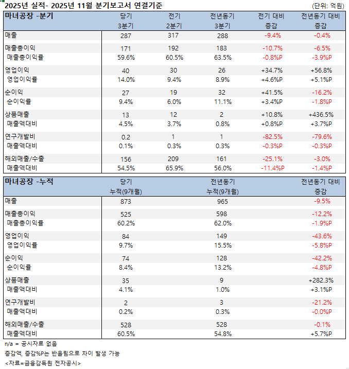 약업신문 자매지 화장품신문이 금융감독원 공시 2025년 11월 분기보고서(연결기준) 분석 결과, 마녀공장은 올해 3분기 287억원의 매출을 올린 것으로 나타났다. 전기 317억원 대비 9.4%, 전년동기 288억원 대비 0.4% 각각 감소했다. 영업이익은 40억원으로 전기 30억원 대비 34.7%, 전년동기 26억원 대비 56.8% 각각 성장했다. 순이익은 27억원을 기록해 전기 19억원 대비 41.5% 증가했으나, 전년동기 32억원보다는 16.2% 감소했다.