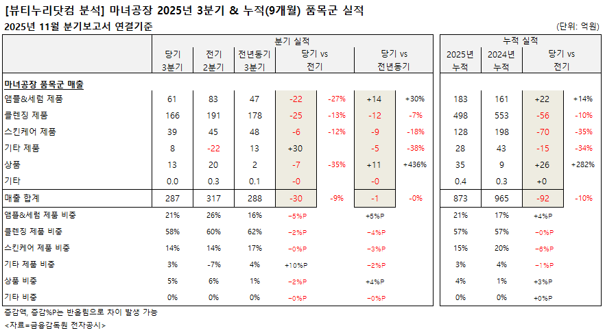 스킨케어 제품 3분기 매출은 39억원으로 전기 45억원 대비 12%, 전년동기 48억원 대비 18% 각각 줄었다. 비중은 14%. 3분기 누적 매출은 128억원으로 전년동기 198억원 대비 35% 역성장했다. 비중은 전년동기 20%에서 15%로 축소됐다.