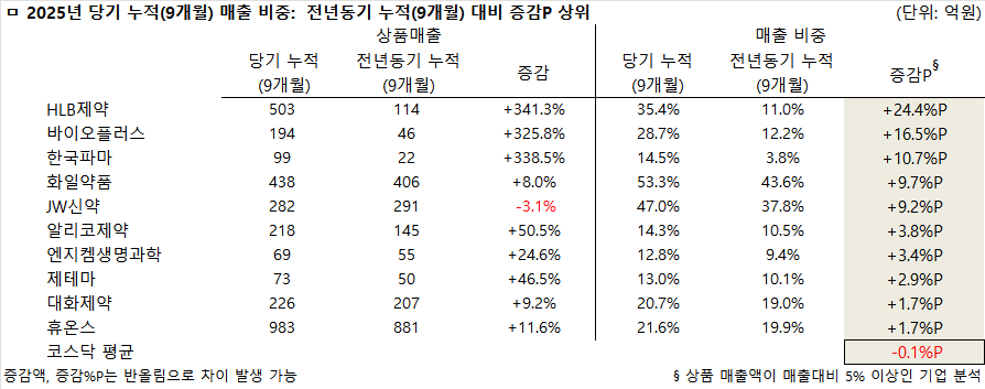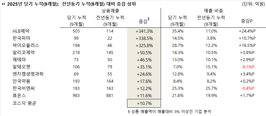 3분기(누적) 코스닥 제약바이오 평균 상품 비중 증감은 -0.1%p로 큰 변화가 없었으나, 상위권 기업들은 10~20%p 이상 비중을 늘리며 사업 구조를 급격히 변경하는 모습을 보였다.