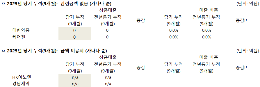 대한약품, 케어젠은 누적 상품매출 관련 금액이 없었고, HK이노엔, 경남제약은 관련 내용을 공시하지 않았다.