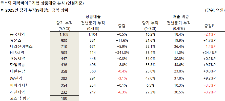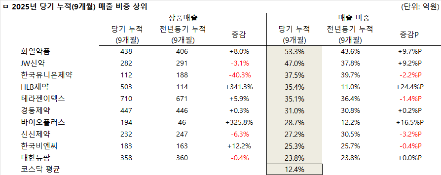 3분기(누적) 코스닥 제약바이오 매출 비중의 평균 상품 비중은 12.4%로 코스피(24.7%)보다 낮은 편이나, 상위권 기업들은 30%~50%를 넘나들며 높은 의존도를 보이고 있다.