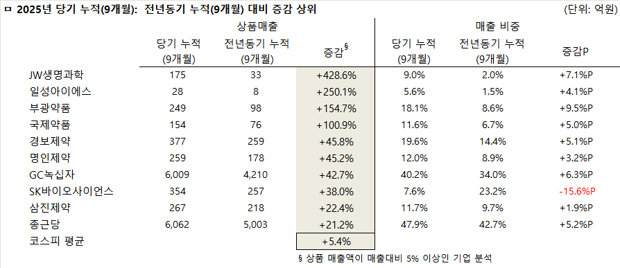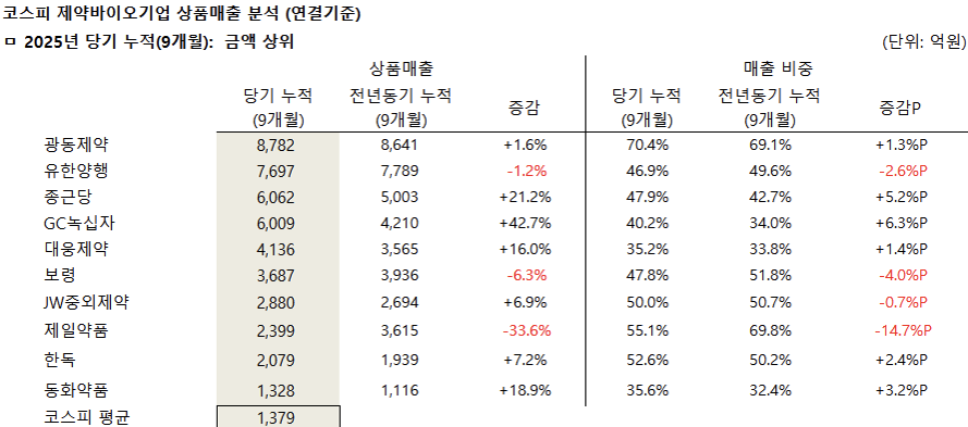 광동제약과 유한양행은 3분기 누적 실적만으로도 이미 7~8천억 원대를 기록하여, 연간 기준 상품매출 1조 원 달성이 유력해 보인다.