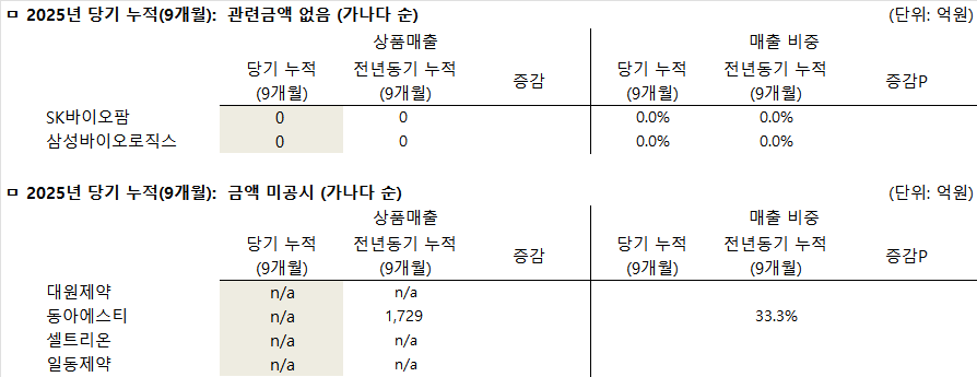 SK바이오팜과 삼성바이오로직스는 누적 상품매출 관련 금액이 없었고, 대원제약, 동아에스티, 셀트리온, 일동제약은 관련 내용을 공시하지 않았다.