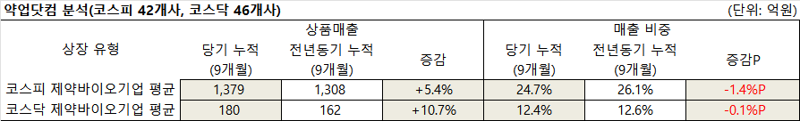 | 2 | 상장 제약바이오기업 3Q 누적 평균 상품매출...코스피 5.4%, 코스닥 10.7%↑ |