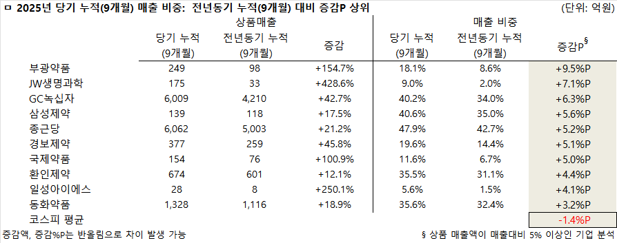 이어 삼성제약 (5.6%p), 종근당 (5.2%p), 경보제약 (5.1%p), 국제약품 (5.0%p), 환인제약 (4.4%p), 일성아이에스 (4.1%p), 동화약품 (3.2%p) 순으로 상품매출 비중이 늘었다.