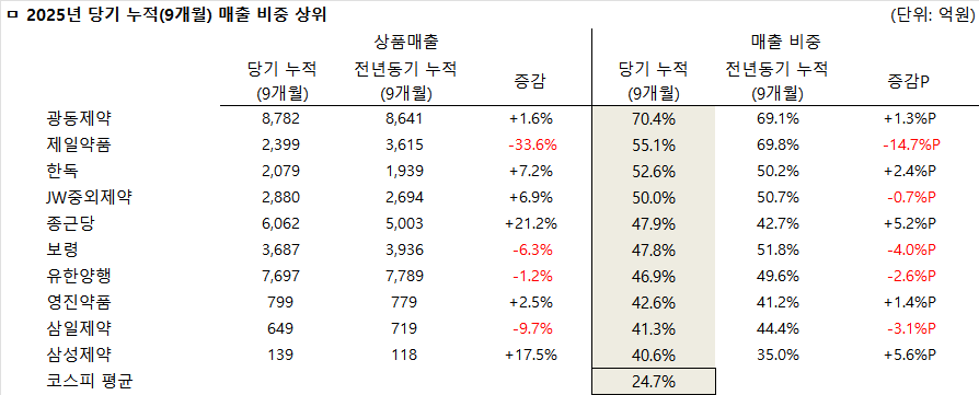 제일약품(55.1%), 한독(52.6%), JW중외제약(50.0%)은 매출의 절반 이상을 상품에 의존하고 있다.