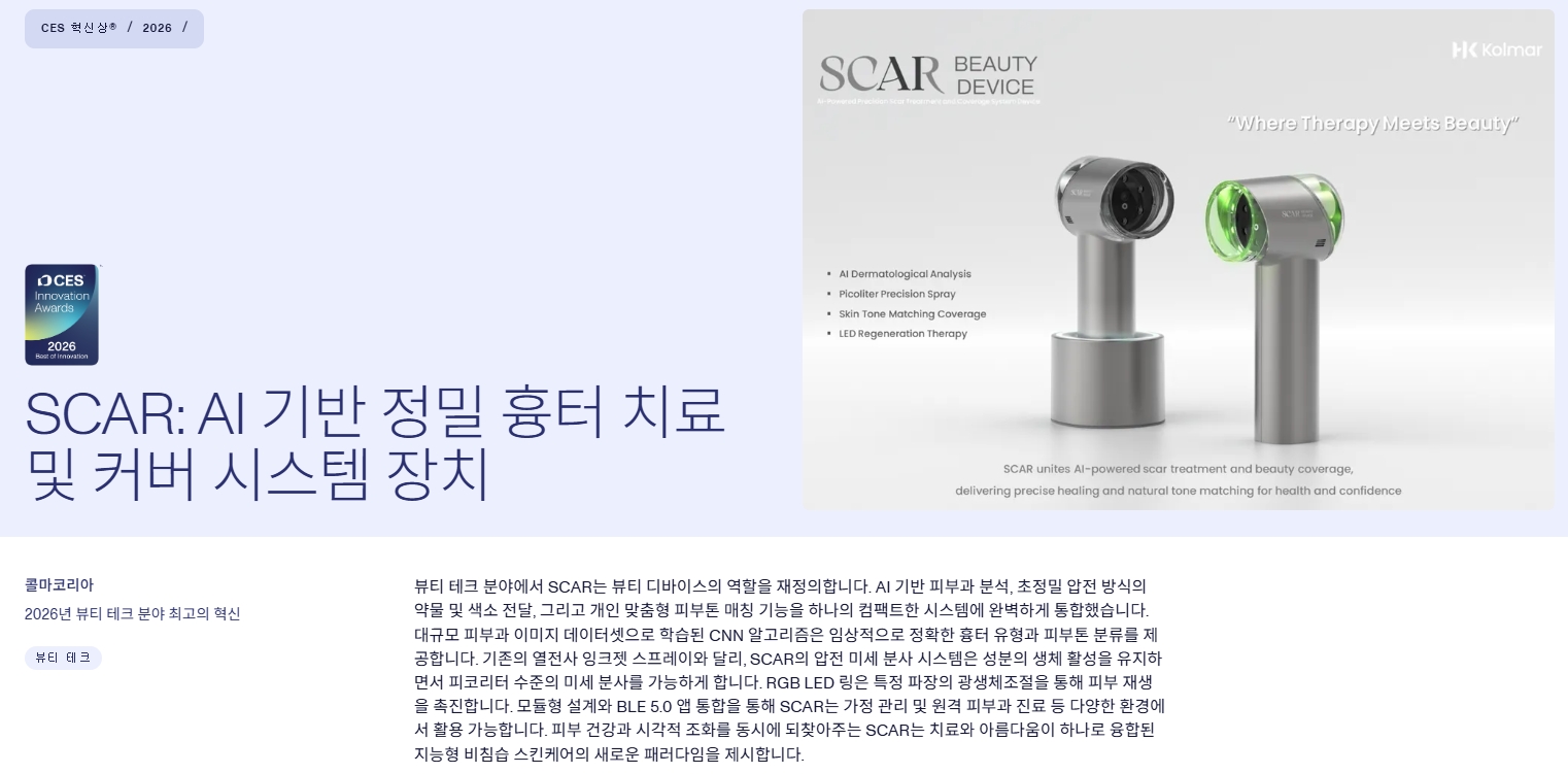 한국콜마는 4개 규모의 대형 부스에서 상처·흉터 케어를 위한 ‘SCAR 뷰티 디바이스’ 를 소개한다. 이 기술은 디지털 헬스·뷰티 테크 영역에서 동시 수상하고 뷰티테크 부문 최고혁신상'까지 거머쥐었다. 최고혁신상은 같은 분야 혁신상 수상작들 중 가장 뛰어난 제품에 주어지는 최상위 상이다.