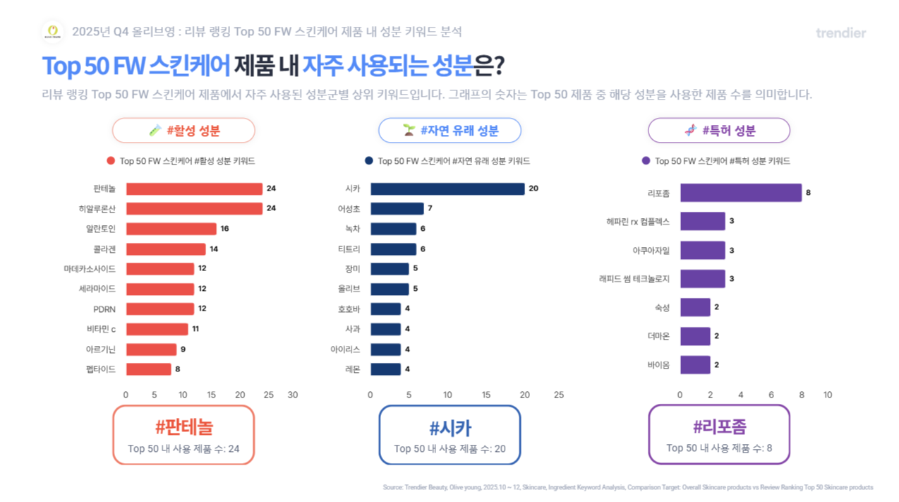 새롭게 떠오르고 있는 성분을 살펴보면, 국내에선 ‘효능의 목적성’이 한층 선명해지고 있다. 올리브영과 네이버의 상위권 제품들 모두 보습과 진정을 전제로 한 성분 구성을 유지하면서도, 계절감 등에 맞춰 피부 회복과 상태 개선을 직접적으로 겨냥한 키워드가 추가로 부각됐다.