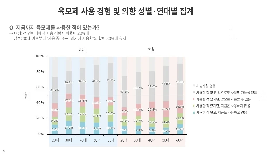 실제 육모제 사용 경험과 향후 이용 의사에서도 세대별, 성별 특징이 명확히 드러났다. 남성의 경우 20대를 제외한 전 연령대에서 육모제를 현재 사용 중이거나 과거 사용 경험이 있는 사람의 비중이 30% 이상으로 유지됐다. 반면, 여성은 전 연령대에서 해당 비율이 20%대에 머물렀으나, 40대와 50대 여성의 20% 이상이 '현재 사용하고 있지는 않지만 향후 사용할 의향이 있다'고 답해 잠재적 고객층으로서의 성장 가능성이 있는 것으로 나타났다.